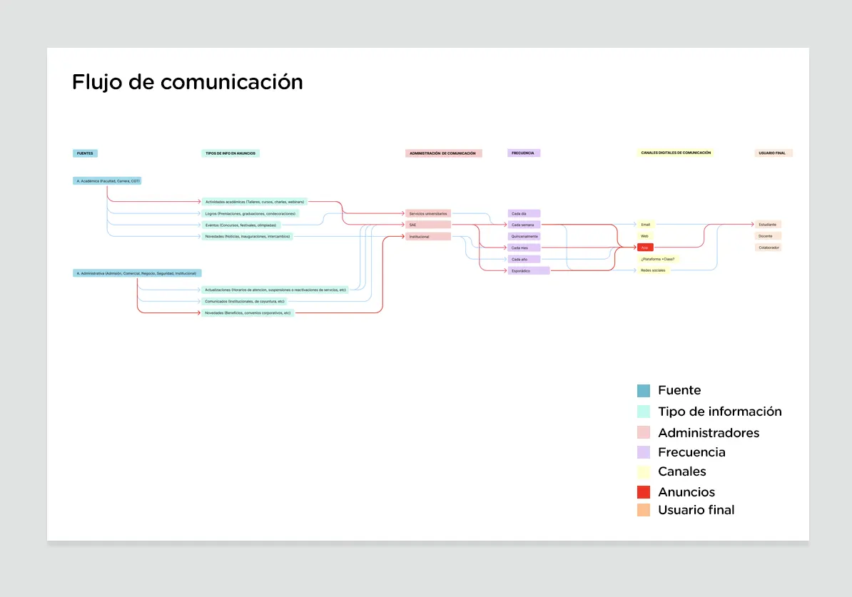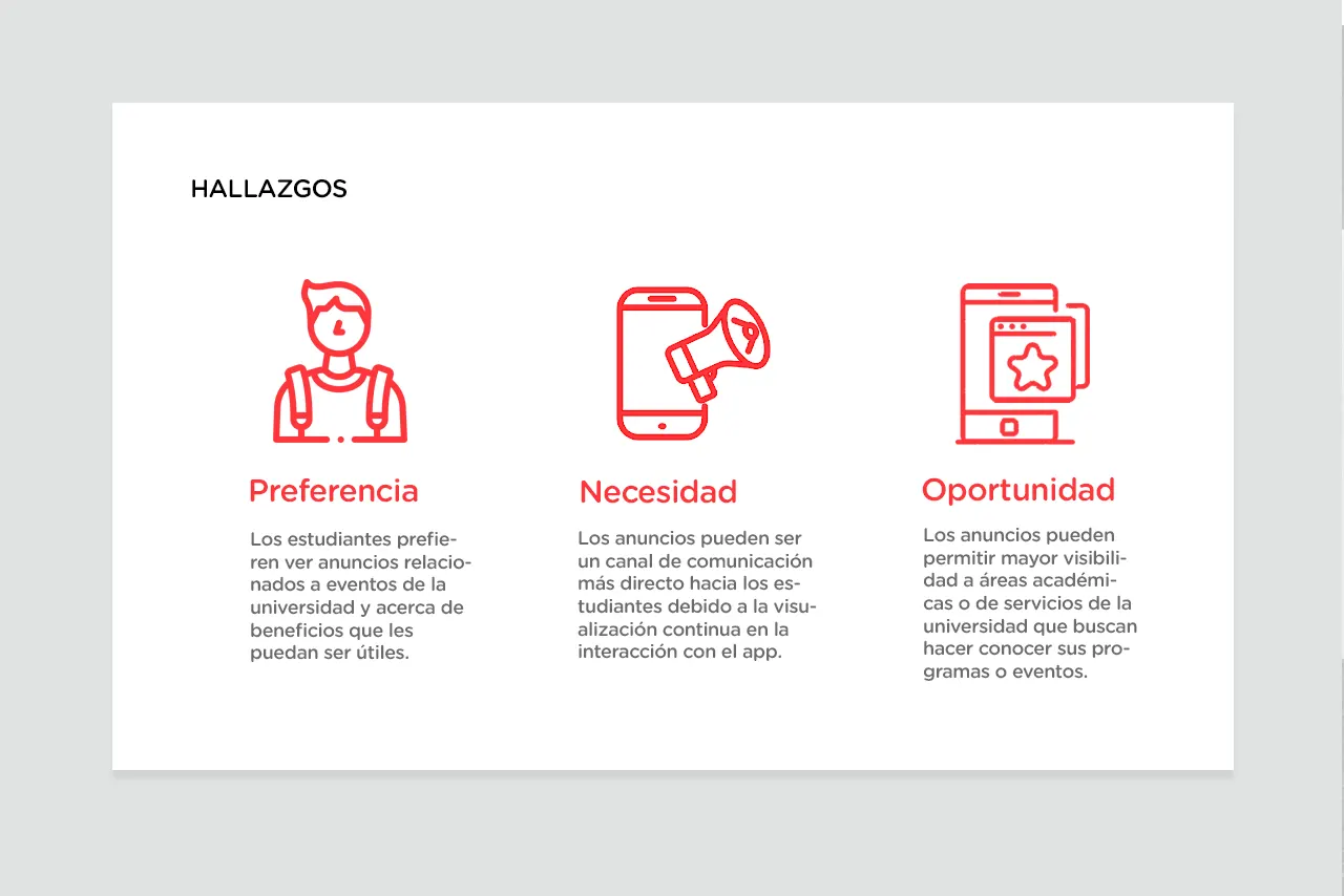 El proceso de investigación incluyó recoger información acerca de cómo se manejaban las publicaciones en las diferentes plataformas digitales de la universidad, revisión de datos e información sobre el comportamiento de los estudiantes y su interacción con las comunicaciones digitales de la universidad, reuniones con stakeholders para tener en cuenta el rol de los anuncios en la estrategia de comunicaciones, asi como realizar un benchmarking de las apps y sitios familiares para los estudiantes a fín de conocer los formatos y tipos de anuncios con los cuales interactuaban en su día a día.