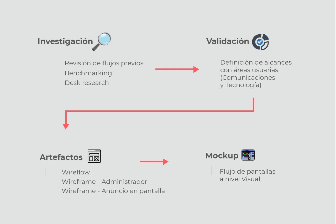 Asimismo, para el rediseño del administrador de anuncios se revisaron varias plataformas similares de administración de contenido utilizadas en la universidad y se realizaron múltiples reuniones con el área de tecnología para determinar los alcances del proyecto.