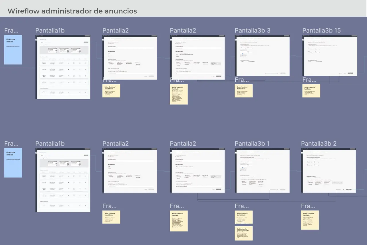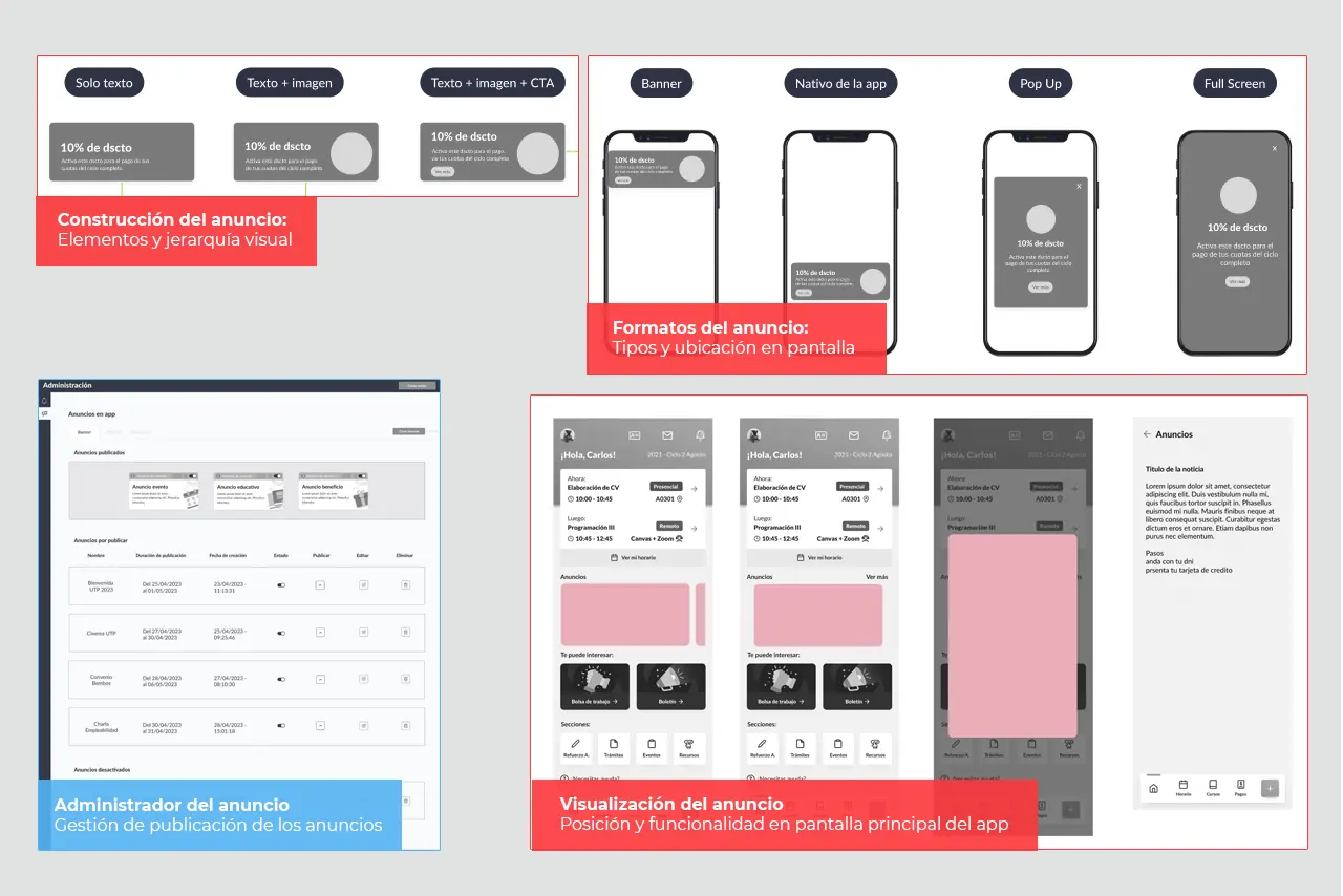 Luego de realizar los ajustes de interacción y la revisión a nivel de UI, se propuso las siguientes pantallas tanto para el bloque de anuncios en app como para su administrador.