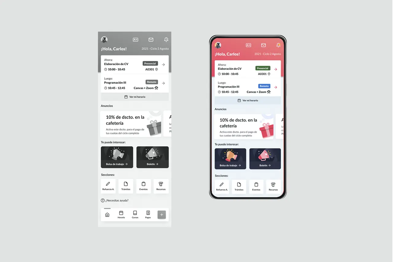 El reto de diseño: Diseñar un nuevo bloque de anuncios para la pantalla principal de la app de la universidad, y también el rediseño de un sistema de administración que permita el ordenamiento y publicación de dichos anuncios.