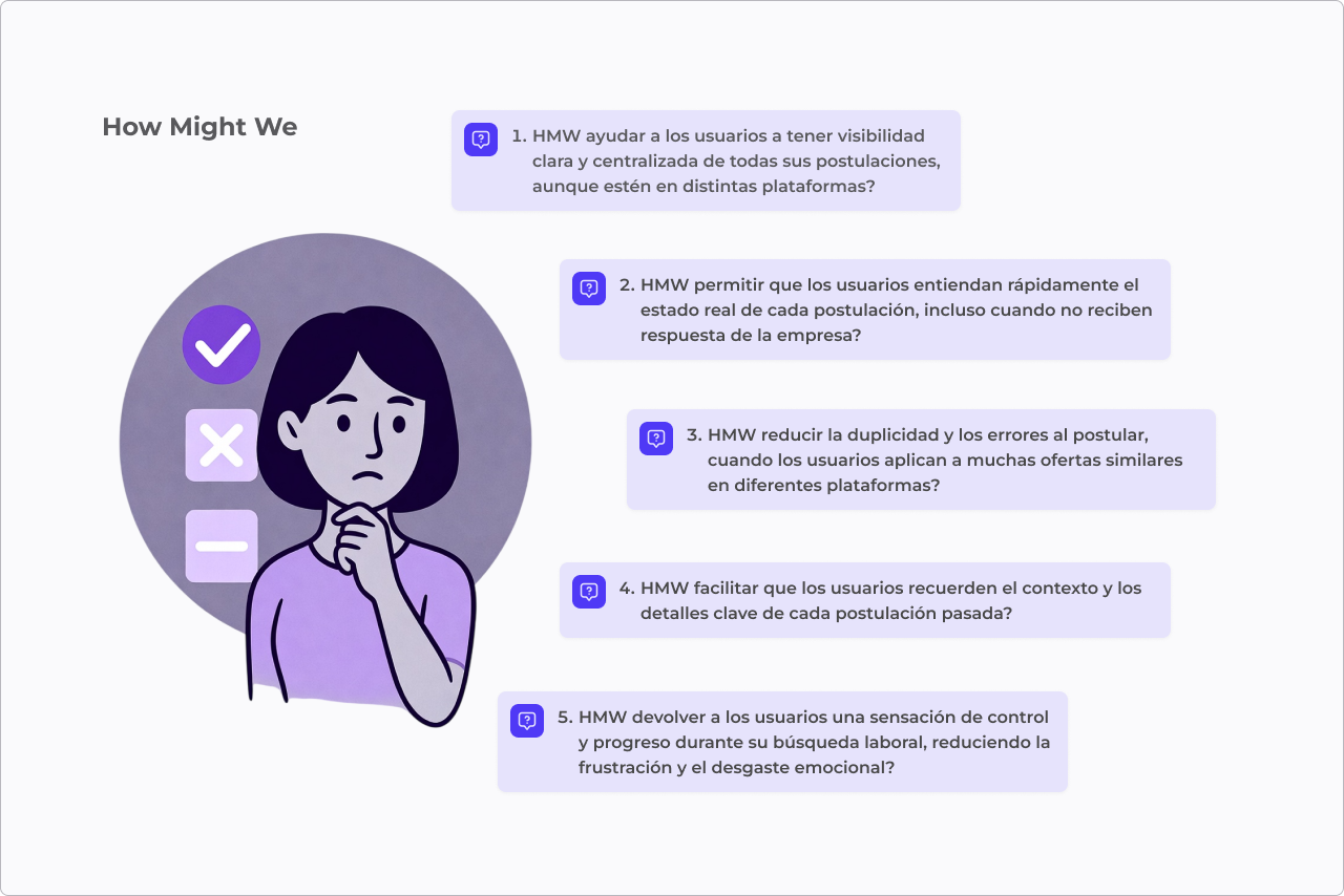 El reto de diseño: Diseñar una solución que permita al usuario el ordenamiento, control, y administración de sus postulaciones laborales para entender mejor su desempeño en los procesos, roles a los que aspira, evitando desgaste mental y ahorrando tiempo.