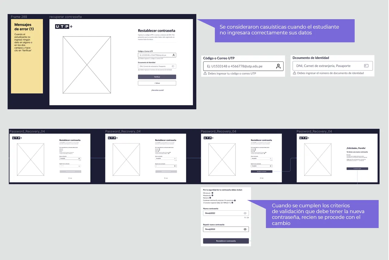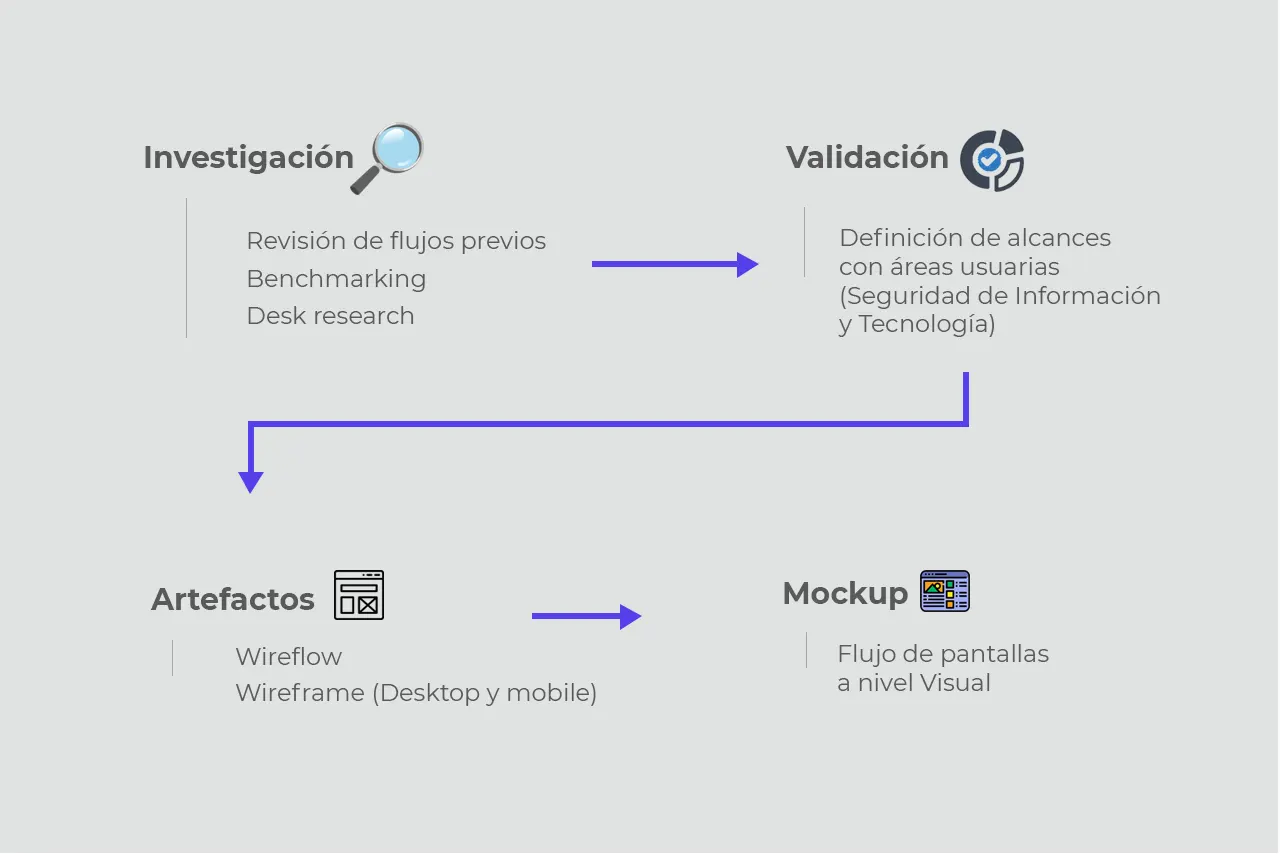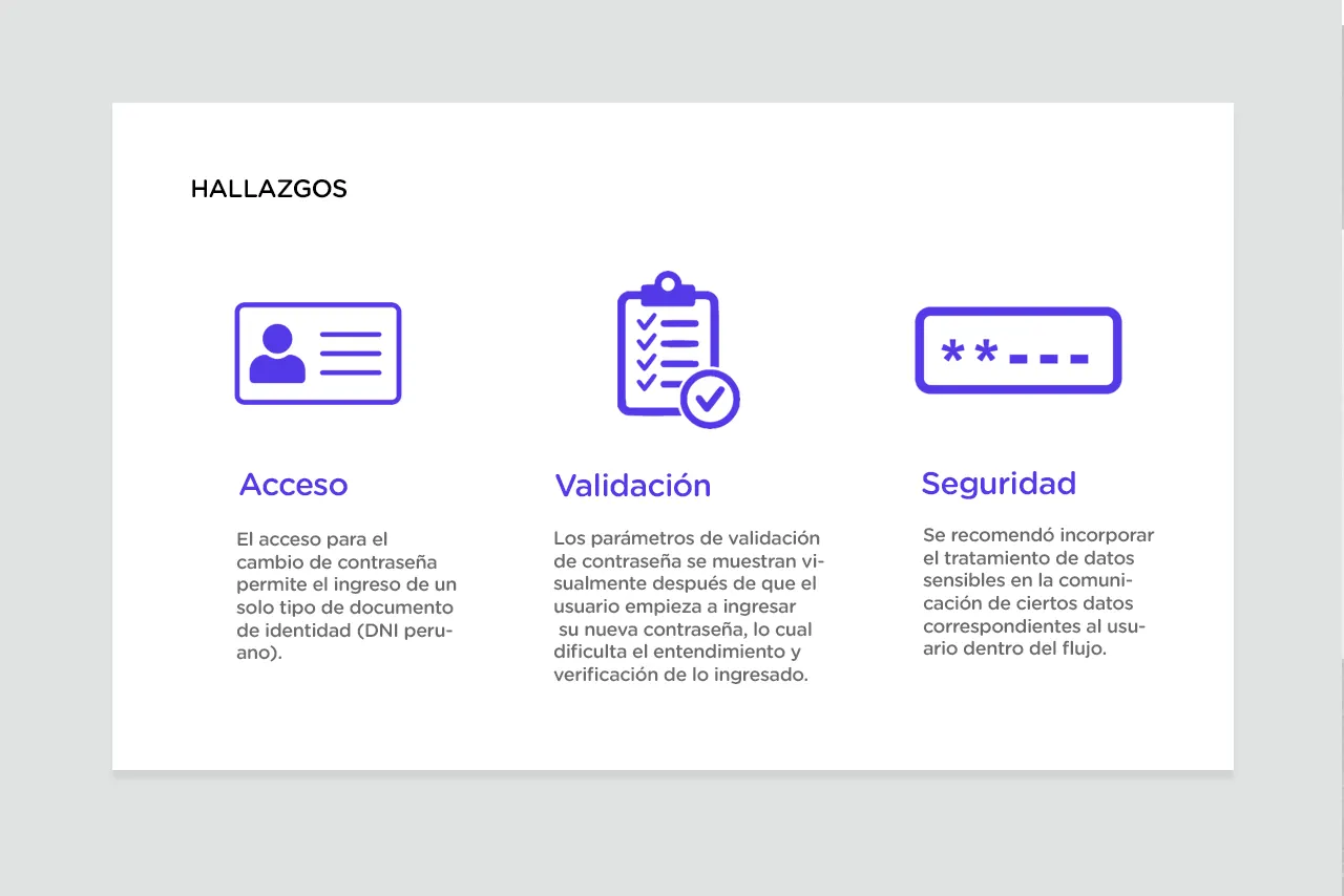 Teniendo como base la versión actual del portal de cambio de contraseña ya en producción, se revisaron los flujos de diseño iniciales para identificar los aspectos claves a considerar, también se consideraron las diferentes pantallas de login hacia las diferentes plataformas y se recopilaron múltiples referencias de funcionalidades similares en productos y sitios externos para tener en cuenta flujos diferentes y detalles en los wordings a utilizar.